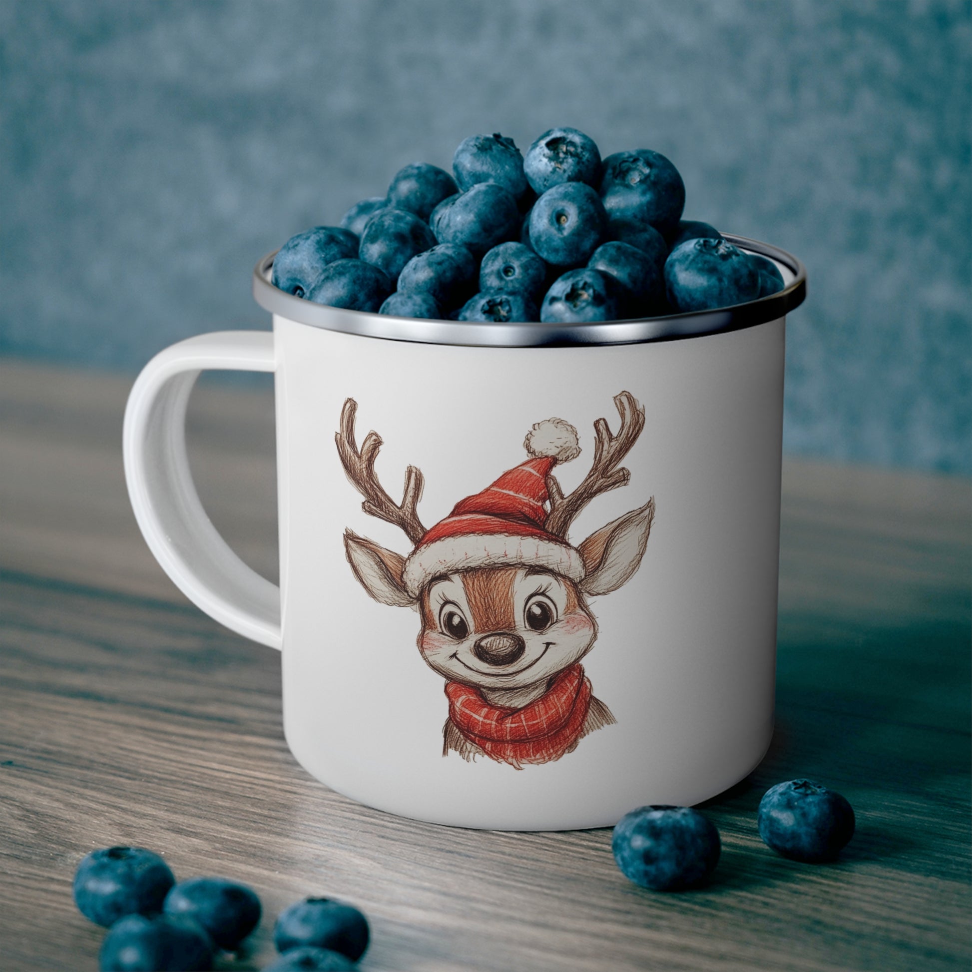 Embrace the holiday spirit with this charming enamel Christmas mug, featuring a hand-drawn reindeer illustration that’s bound to bring smiles! The design shows an adorable reindeer with antlers, wearing a cozy red scarf and a Santa hat, giving it a whimsical winter feel. This mug is perfect for enjoying your favorite holiday drinks, from hot chocolate with marshmallows to warm apple cider, coffee, or tea. Made from durable enamel, it's lightweight and travel-friendly, making it ideal for cozying up by the fireplace or taking on winter adventures. This festive reindeer mug is more than just drinkware—it's a seasonal decor piece that enhances your Christmas table setting or adds holiday charm to your kitchen. Great for gifting to family, children, friends, teachers, or coworkers, it makes a wonderful stocking stuffer, Secret Santa gift, or present for anyone who loves festive accessories. With its cute and classic design, this Christmas mug is sure to be a holiday favorite year after year.
