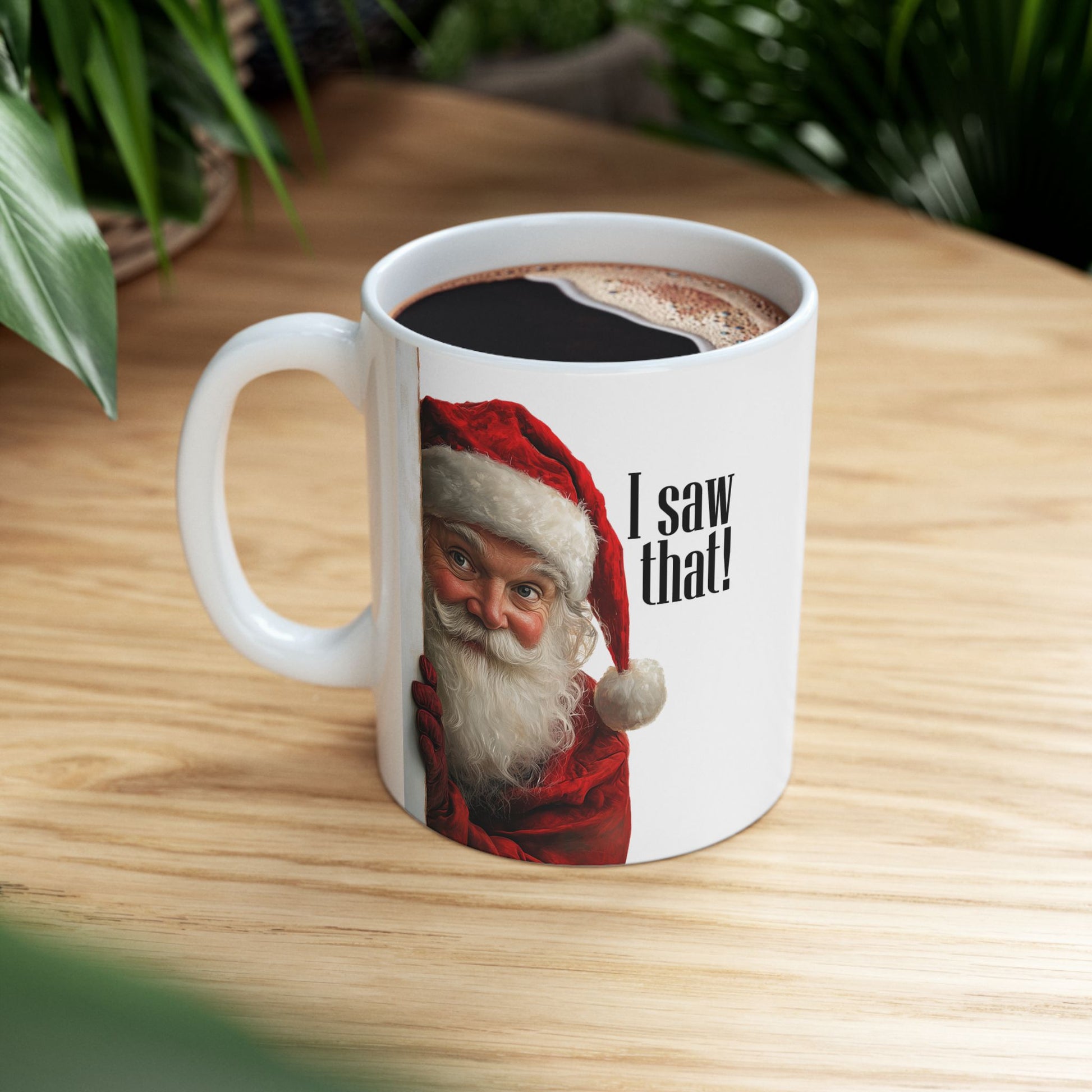 "I SAW THAT-Naughty List" Santa Claus Mug-Christmas Mug, Gift for Her or Him Get festive with a touch of humor with this Santa Claus mug featuring a playful print of Santa peeking around the corner. Perfect for anyone who loves a good laugh during the holiday season, this mug is ideal for coffee, tea, or hot cocoa lovers. Whether you’re on the naughty or nice list, this Christmas mug adds a fun twist to your holiday mornings. A great gift for her or gift for him, this holiday mug makes an excellent sarcastic Christmas gift for friends, Secret Santa exchanges, or a funny mug for the holidays. +High-quality ceramic +Bold Santa Claus print with a cheeky vibe +Microwave and dishwasher safe +Perfect as a Xmas gift, holiday mug, or funny Christmas present +Suitable for all genders – a great gift for friends, family, or co-workers This Xmas present is sure to be a hit! Whether you’re gifting it or keeping it for yourself, bring some holiday cheer with a little bit of sass! Warm-up with a nice cuppa out of this customized ceramic coffee mug. Personalize it with cool designs, photos or logos to make that "aaahhh!" moment even better.