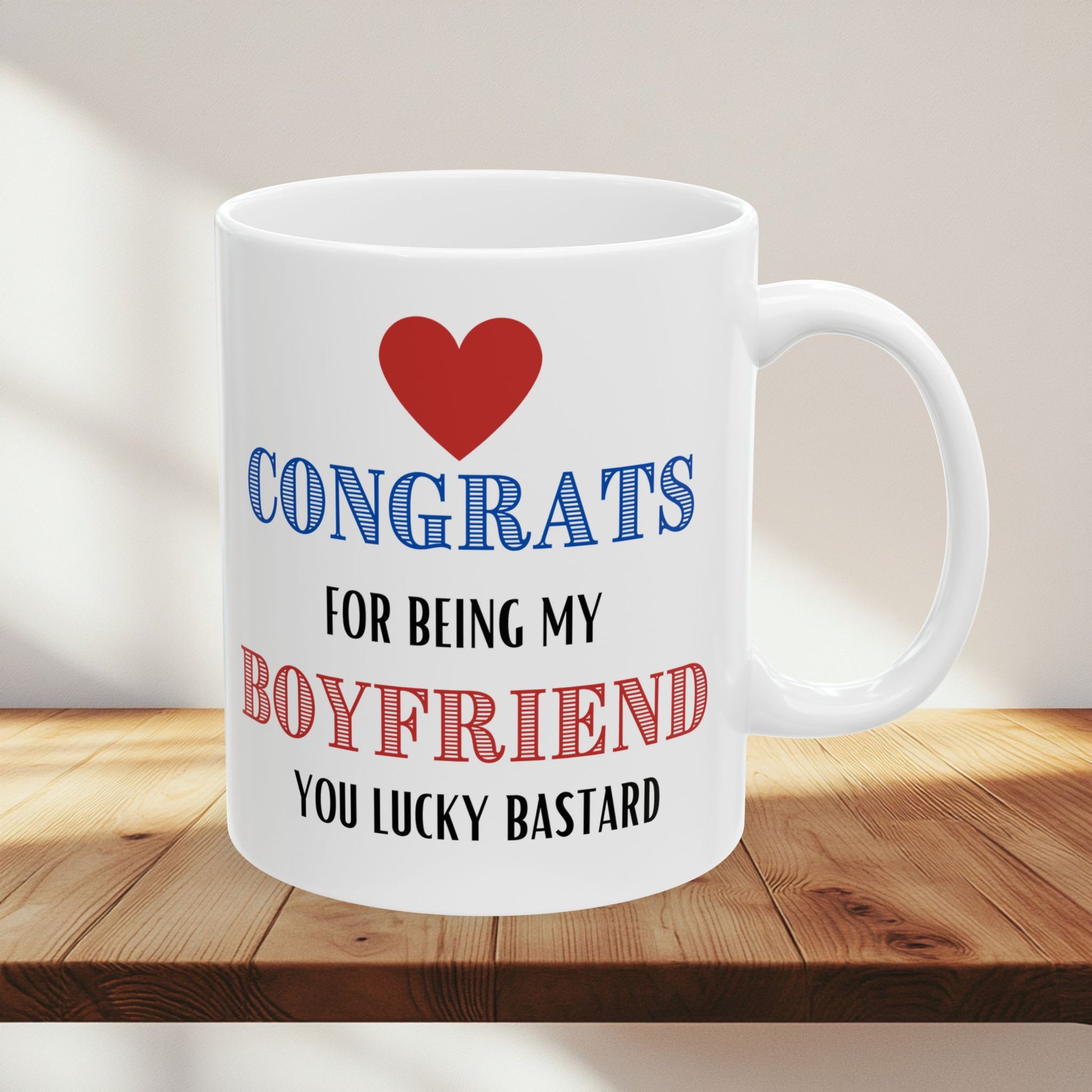 "Congrats for Being My Boyfriend" Funny Romantic Mug – Cute Gift for Him Add some humor and love to your boyfriend’s day with this playful and cheeky mug! Featuring the witty text "Congrats for Being My Boyfriend – You Lucky Bastard" and a heart design, this mug is perfect for showcasing your love while keeping things lighthearted and fun. Whether it’s his morning coffee, evening tea, or any drink in between, this mug will remind him how lucky he is (and how much you love him). Ideal for anniversaries, birthdays, Valentine's Day, or just because! Perfect for girlfriends looking to surprise their boyfriend with a humorous yet heartfelt gift. A great pick for couples who love to joke around and celebrate their relationship in style. Show your love with a dash of humor—order now and make his day special!