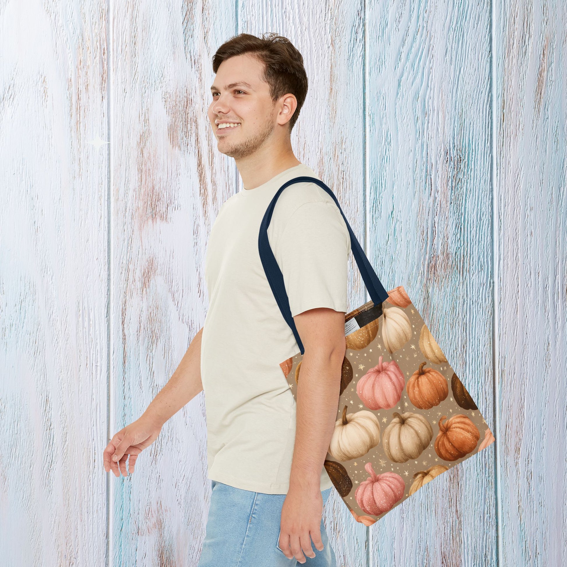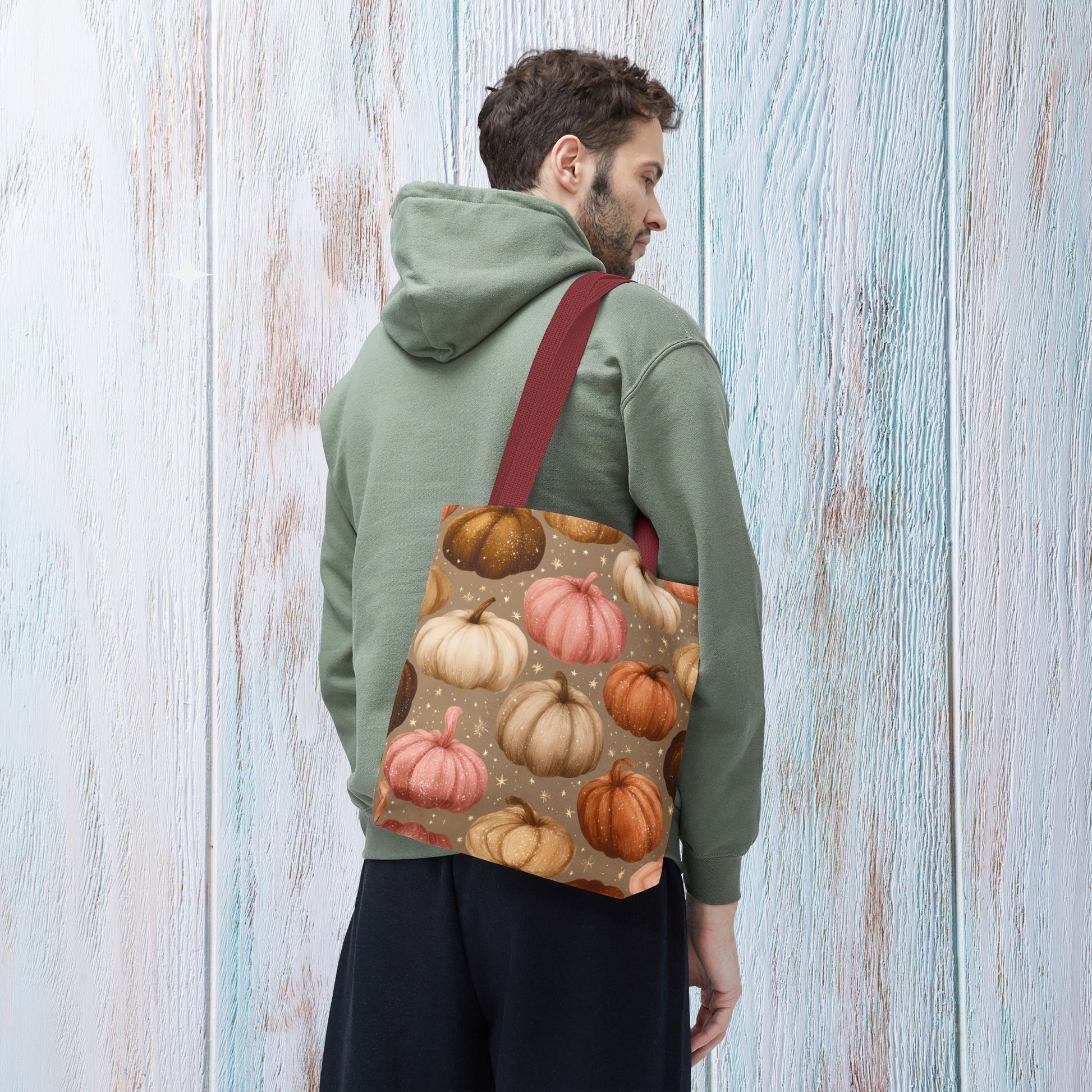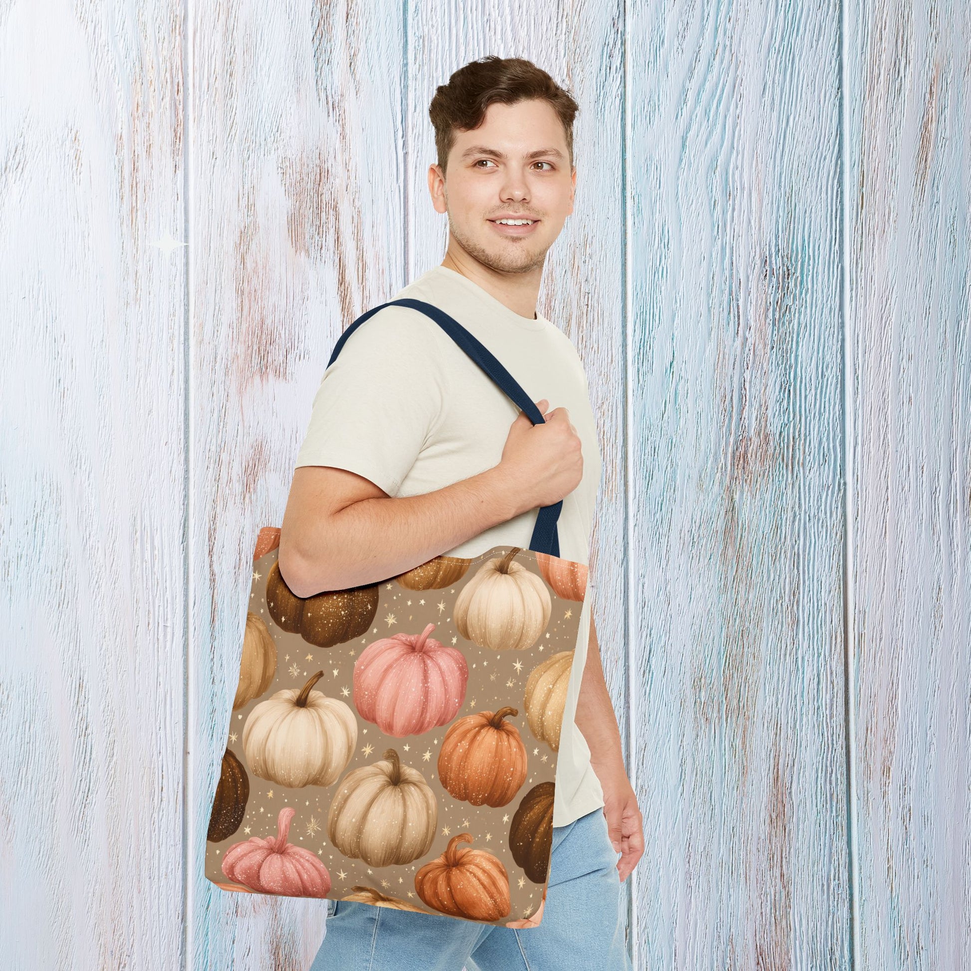 Featuring a charming all-over print of pastel and rustic pumpkins, this reusable tote is perfect for fall farmers’ markets, Halloween trick-or-treating, cozy autumn walks, or as a thoughtful seasonal gift. Made with durable fabric and sturdy black handles, it’s the ideal eco-friendly alternative to plastic bags. Spacious enough for books, groceries, or daily essentials, while adding a festive seasonal touch to your outfit. Perfect for: Fall market & grocery shopping Halloween candy tote for kids & adults Everyday use or work bag Seasonal autumn fashion accessory Gift for pumpkin spice lovers, teachers, moms & friends